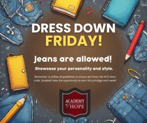 In celebration of the greatness of our scholars, Friday is DRESS DOWN FRIDAY! You’ve earned it, so let’s start the weekend off right. Of course, you must make sure that your “fit” is dress code appropriate. If there are any questions, please contact the school.